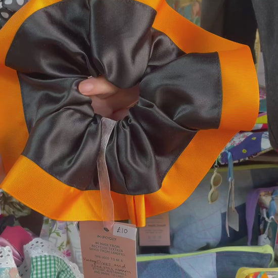 Giant Black Satin and Orange Ribbon Trim Scrunchie