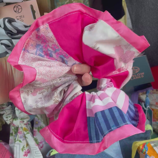 Made from pink with whites and blue scraps of upcycled materials, giant scrunchie with ribbon trim.