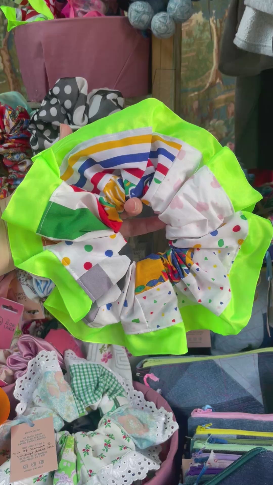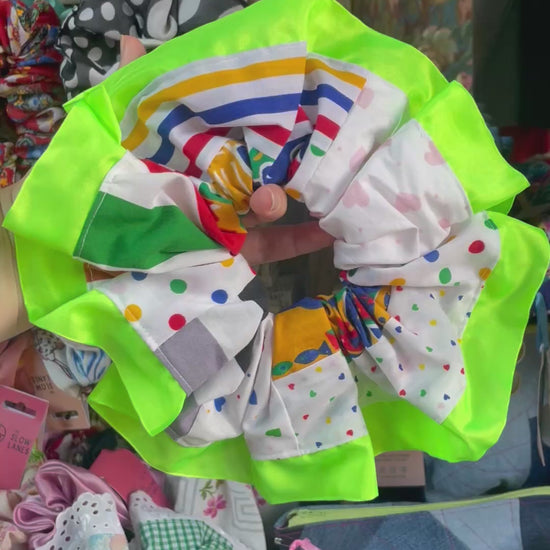 Made from green scraps of upcycled materials, giant scrunchie with neon green trim.