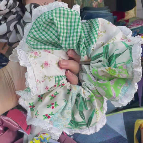 Made from green scraps of upcycled materials, giant scrunchie with vintage lace trim.